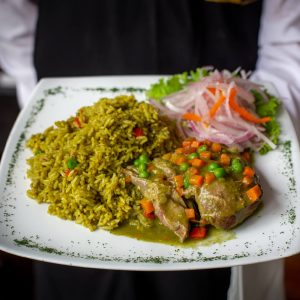 Receta en base a trozos de mondongo y papa, acompañada con arroz blanco.